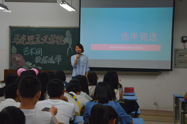 本次选举过程共有竞职演讲、才艺展示、评委提问三个环节。一号、二号选手皆以唱歌竞演的方式点燃竞选的热度,博得在场评委和观众的阵阵掌声;三号选手的诗歌朗诵感情充沛,语调婉转,令人赞叹;七号选手独具匠心,以一段模仿主持秀将大会气氛推向一个高潮。在竞选过程中的每个环节,每位选手行为举止皆大方得体,不仅展示了自己的才华、表达了对文娱的热爱,更体现了自己为今后艺术团的蓬勃发展不断努力的决心。