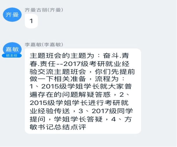 考研就业目标定位。主题班会于3月17日14:30开始在钉钉线上进行,由2017级辅导员马小又老师统筹协调,并积极联系2011级、2015级共11名毕业生参与。其中胡海鹏为山东大学推免研究生,李敏、张哲泽等为西安交通大学、东南大学等高校硕士研究生;郝梅、游晶分别为西南政法大学、重庆邮电大学移通学院辅导员,彭钰为成都双流中学实验学校政治教师。班会分为考研就业经验分享、解疑答惑、点评总结三个板块。11名学长学姐结合自身经历,分享考研、就业经验教训,给2017级的同学们提供了中肯、有效的指导与建议;在解疑惑环节,2017级同学们纷纷抓住机会,积极提问;方敏副书记做了点评总结。通过主题班会,2017级同学们对自身考研、就业职业目标有了较为清晰的定位与思考。