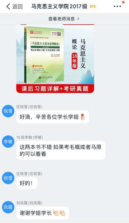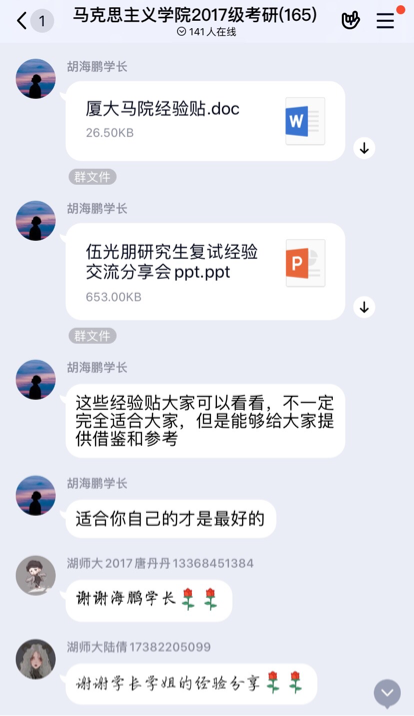 分流确定院校专业。5月8日至5月10每日19:00腾讯线上召开。分析会前,通过对报考地域意愿、目标院校分数线、参考书目等具体信息的再确认,引导2017级同学们重新考虑“人校匹配”问题。三天的报考分析会,分为三个层次进行:第一天讨论“人校基本匹配”的103位同学;第二天讨论报考专业需调整的40位同学;第三天讨论报考专业需调整且暂无匹配院校的21位同学。针对2017级同学们普遍存在的问题,比如专业课的复习方法、如何避免专业撞车、如何选择最合适的学校、真题如何复习等,2015级的学姐学长们和马小又老师都给予了耐心、细致地解答。通过三天有针对性地沟通交流,2017级同学们对目标院校、专业有了更深入的了解和思考。