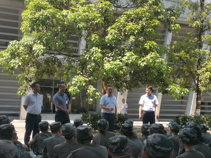 为深入了解2019级新生的军训现状,为在炎炎夏日中给奋斗的新生与教官鼓舞士气,为他们送上最美好的中秋祝福,2019年9月13日11时30分,看漫画 院长陈洪、副院长况明安、党委书记刘军、党委副书记姜土生以及部分学生会成员来到足球场对正在军训的新生表示慰问。此次慰问活动由姜土生老师主持。