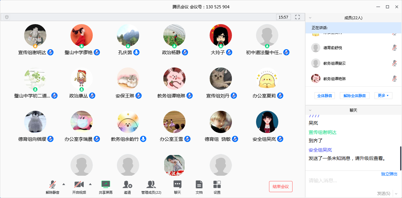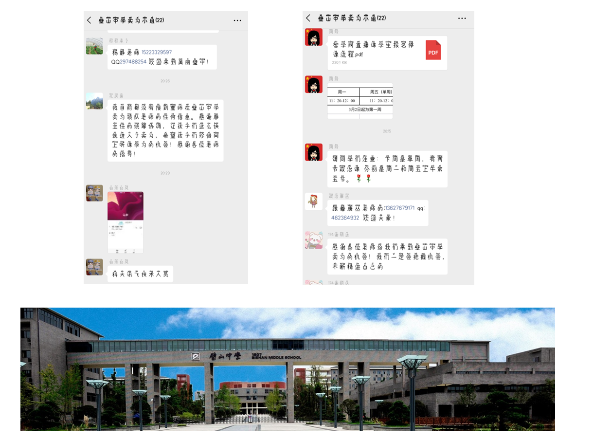 前些日子璧山中学的老师们还在为网课忙得不可开交,这几日便已经把实习的工作安排得明明白白。312日我们在疫情期间首次以如此正式的方式与璧山中学的各位老师取得了联系,在会议上廖主任、吴主任相继发言,强调了线上实习的相关注意事项,着重要求我们注意实习期间的安全问题,耐心地听取了同学们关于实习的问题并做出解答……璧山中学的老师们对于前来实习的我们抱有很大的期望,对我们关切有加。我们也一定把握这次宝贵的实习机会,观摩、学习、反思,就像廖主任提到的,多去想想“如果是我,我应该怎么去做”。