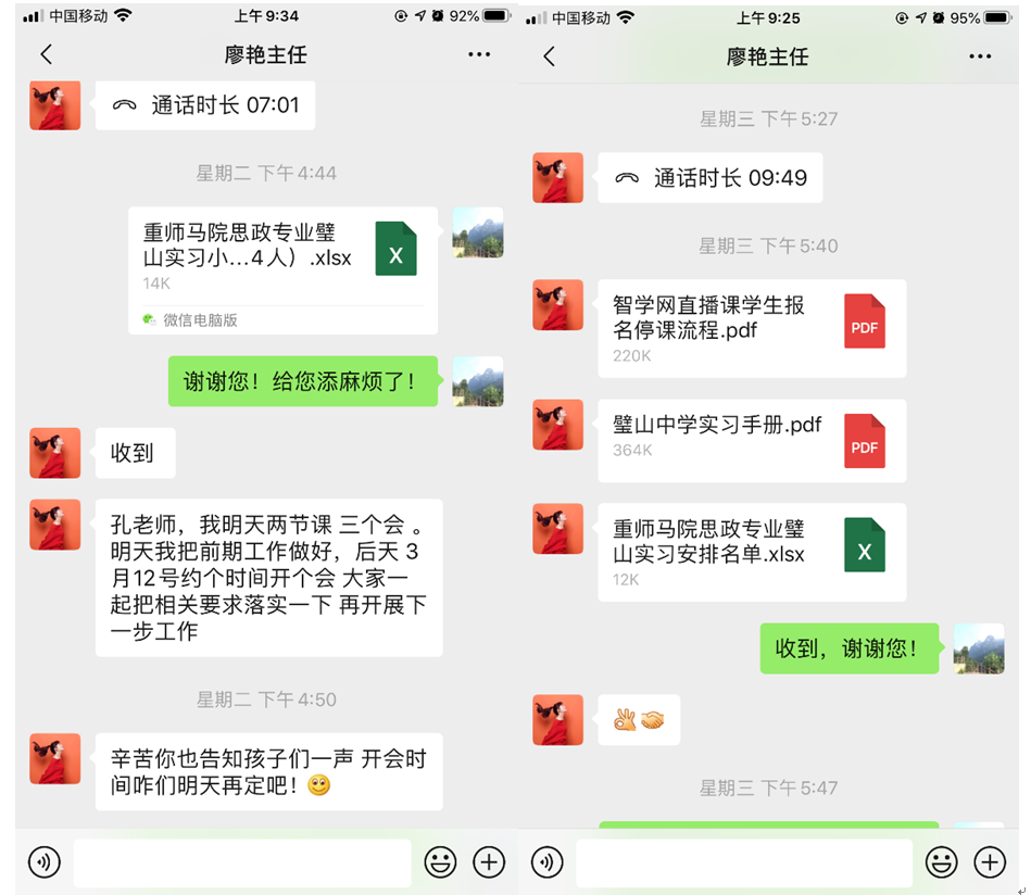 在疫情影响下,秉持着“停课不停学”的原则,重庆市璧山中学于32日便启动了线上教学,而我们也开始了一次别开生面的实习之旅。35日,我们的实习带队老师孔庆茵老师与璧山中学廖艳主任进行了有关实习工作安排的交流,并邀请璧山中学参与此次实习的老师入群。随后小组确定实习规章制度、进行实习小组分工等工作。廖主任发来了智学网直播课学生报名听课流程、璧山中学实习手册、重师马院思政专业璧山实习安排(落实指导教师、登录科大讯飞平台听课的账号密码)。并于312日以腾讯线上会议的形式召开了实习见面会。