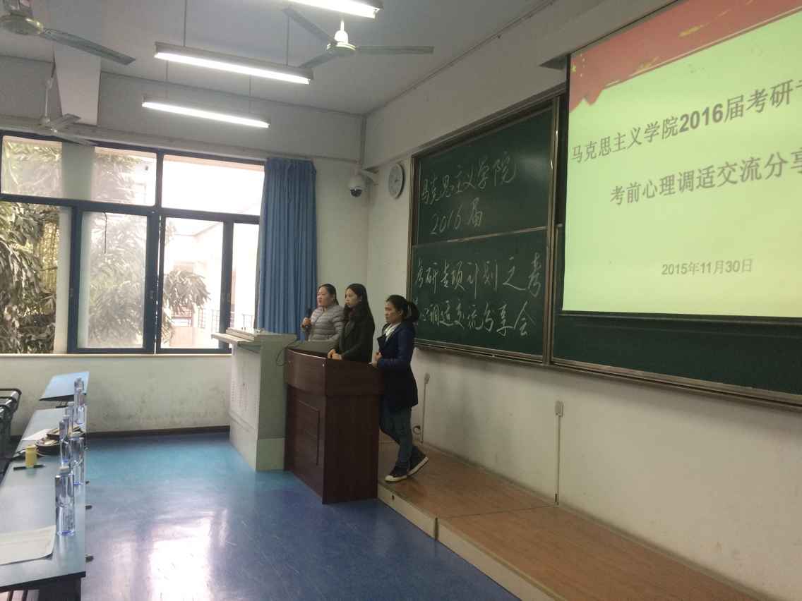 于弘德楼5401教室开展了考研专项提升计划之考前心理调适交流分享会。2011级优秀考研代表余维维、郝梅、张燕霞为主讲人,看漫画