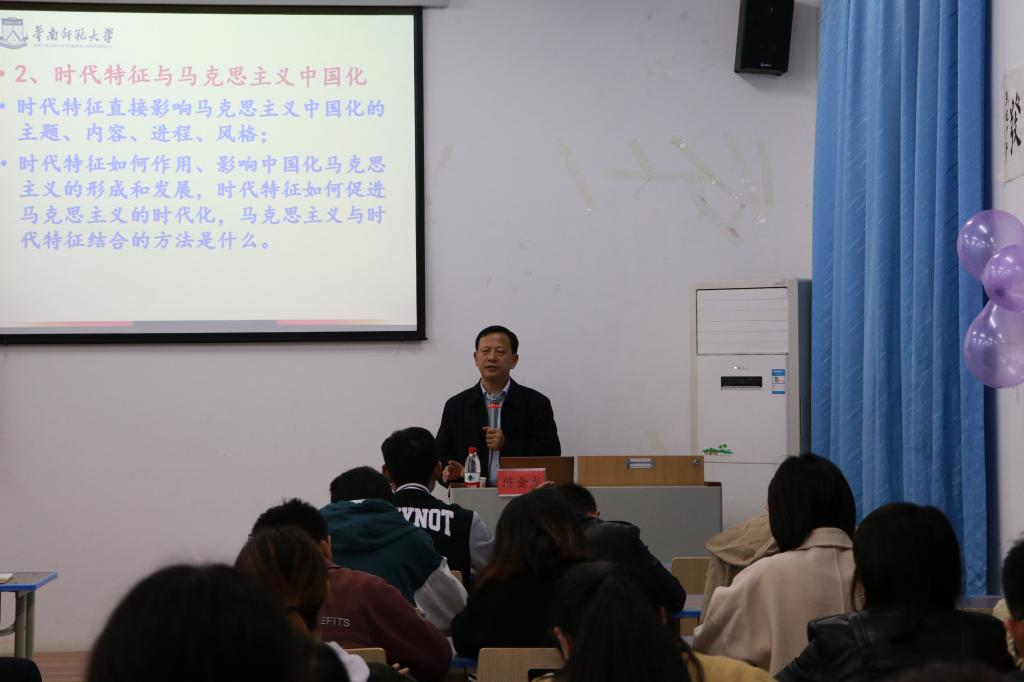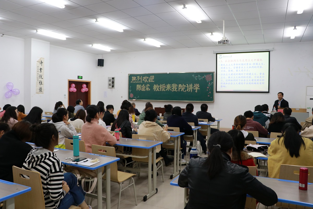 陈金龙教授以马克思主义中国化基本文献研究为切入点,简要介绍了马克思主义基本文献的翻译与传播、接受与提取、形成与传播情况,提出马克思主义基本文献是学科研究的前提,强调了马克思主义基本文献的基础性作用,以及许多马克思主义及中国化马克思主义基本文献值得我们深入研究的问题。围绕本次讲座的主题,陈教授还从马克思主义中国化的历史进程研究、核心概念研究、理论谱系研究、社会传播研究、基本理论研究、重大现实问题研究、海外评价与研究的审视等方面展开了深入论述。他提出,核心概念是研究的载体,我们要注重概念在不同时代的含义及指向,强调我们要关注重大现实问题、重大理论问题、重大实践问题和重大经验总结,积极运用马克思主义视角思考现实问题、提升实践经验。最后,陈金龙教授还分享了自身治学经验,对在场同学提出要具备学术品质和道德品质、加强学术和科研意识、运用多学科的研究方法、形成有特色的固定研究领域及方向、从学术的维度思考现实问题、由模仿到形成自己的风格等殷殷嘱咐。陈教授的报告视野宏大,思想深邃,视角独到,阐释充分,深入浅出,语重心长,为师生带来了一场历史与现实、时间与空间、横向与纵向、国际与国内、理论与实践紧密结合的学术和精神大餐,赢得了师生们的广泛认同和高度肯定。