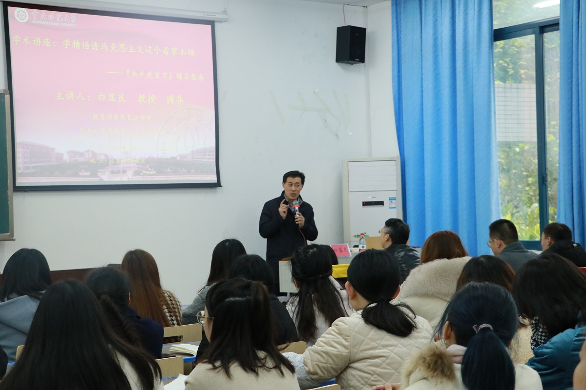 白教授讲课风格幽默风趣、深入浅出,为师生们带来了一场精彩的学术盛宴。他深入浅出的讲解让师生们对《共产党宣言》有了更为深刻的认识,对大家继续研读《共产党宣言》具有指导意义。讲座最后,陈洪院长对白显良教授的精彩讲解表示衷心的感谢。他指出,第一,我们要乐于养成阅读经典著作的日常习惯;第二,我们要沉下心来勤于研读经典著作;第三,我们要善于运用马克思主义视角分析问题。