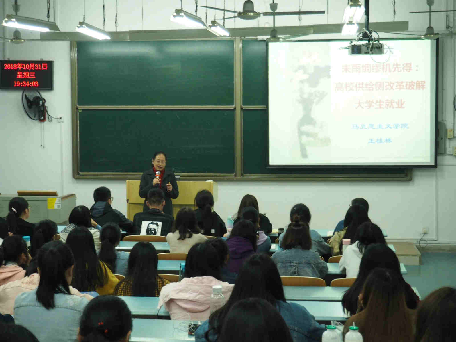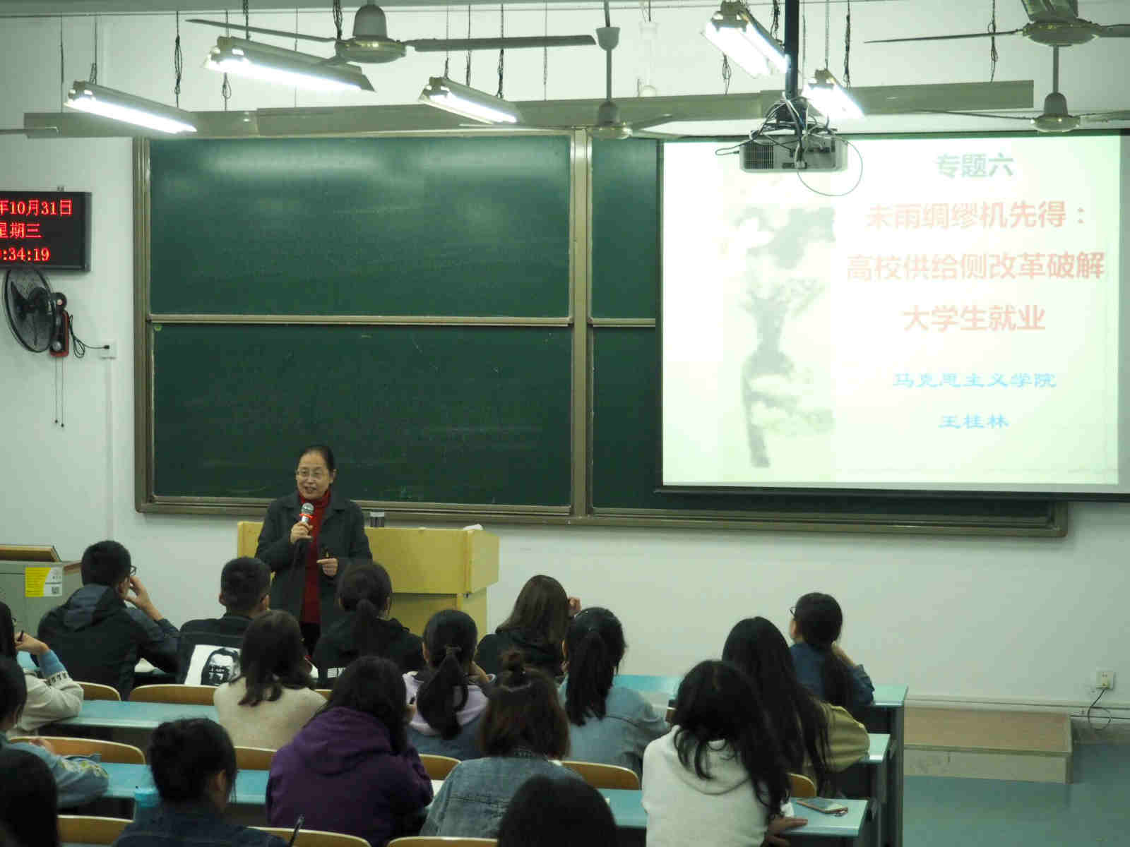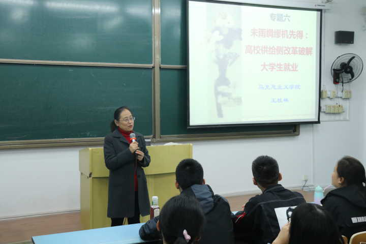 教学督导室主任王桂林教授主讲,主题是“未雨绸缪机先得:高校供给侧改革破解大学生就业”。讲座由看漫画