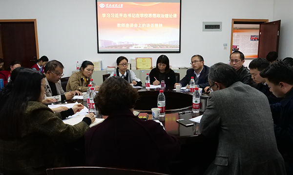 最后,陆远权副校长做总结发言,陆校长高度肯定了此次交流座谈会,各师生代表发言积极,见解深刻,情到深处,站位很高。并对下一步工作做了三点要求:一是进一步深入学习习近平总书记在学校思想政治理论课教师座谈会上的讲话精神,拟定学习计划,学习纲要,纳入政治学习和组织生活安排,切实把讲话精神学习好、领会好、贯彻好。二是活学活用,要把习近平总书记在学校思想政治理论课教师座谈会上的讲话精神融入到课堂教学之中,引领好学生,帮助学生坚定理想信念。三是用实际行动体现学习成效,主动思考,边学边做,把学习成效以科研成果展示出来,将学习贯彻讲话精神落到实处。
