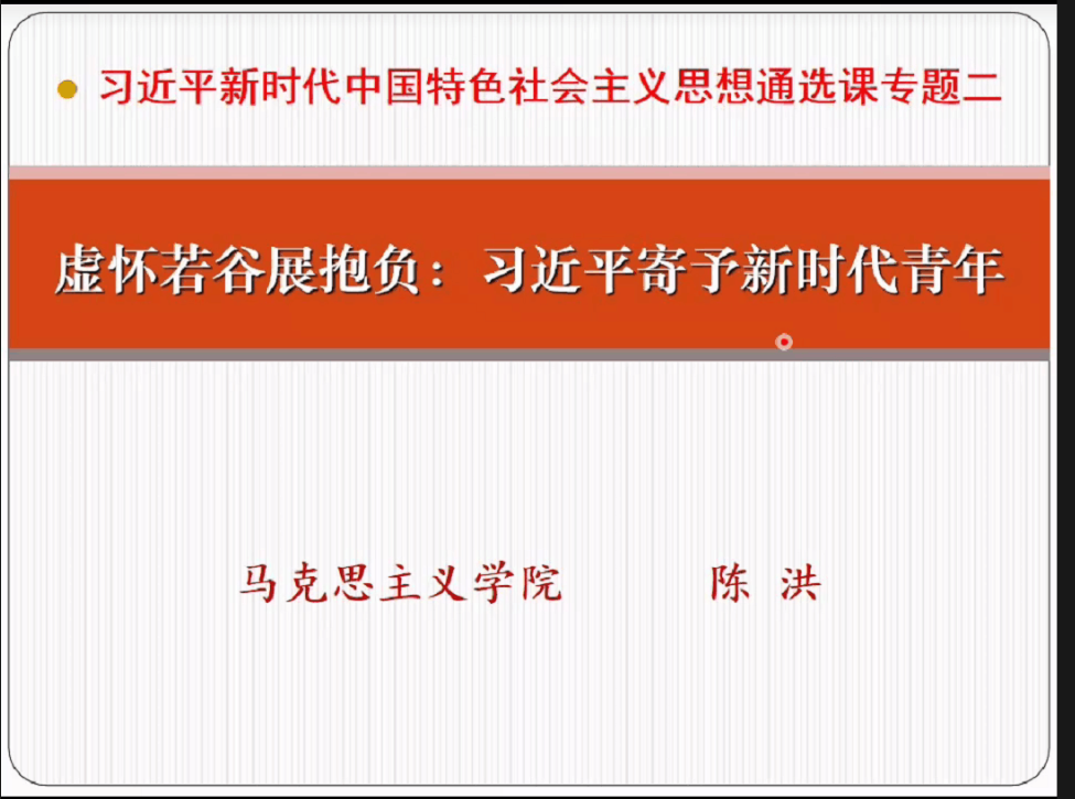 院长陈洪教授主讲,讲课主题为“虚怀若谷展抱负:习近平寄语新时代青年”。本次授课采用了QQ群课堂直播的线上教学形式,选课同学按时、全部参与了此次线上教学活动。