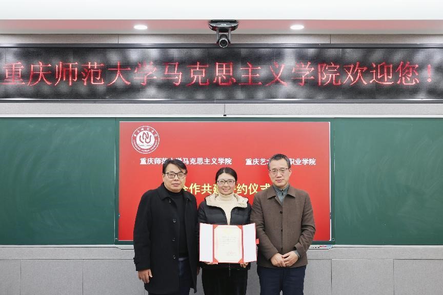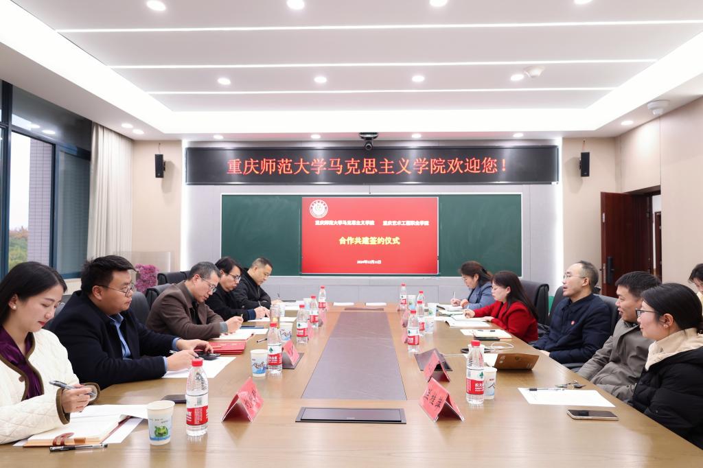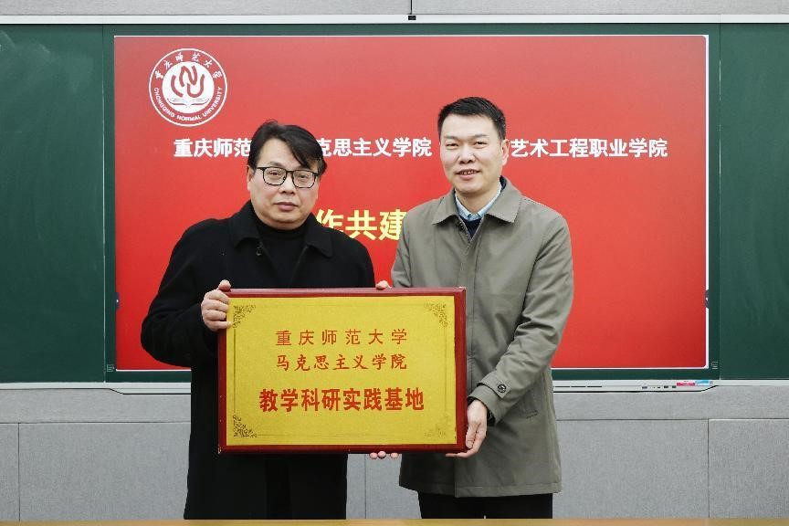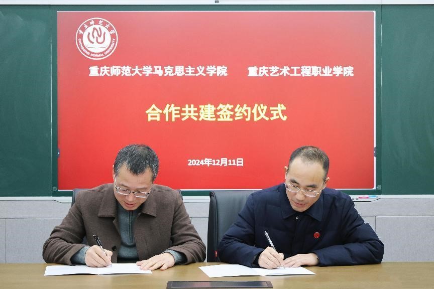 与重庆艺术工程职业学院举行合作共建签约仪式。双方经友好协商决定,为深入学习贯彻习近平总书记关于思政课建设的重要指示精神和关于教育的重要讲话精神,贯彻落实全国和重庆市教育大会、全国和重庆市新时代学校思政课建设推进会的重要精神,全面贯彻党的教育方针,落实立德树人根本任务,打造新时代西部思政教育新高地,推进《重庆市推进新时代学校思政课建设行动方案(2024-2027)》,构建大中小学思政教育一体化建设格局,落实公办民办院校“手拉手”、本科专科院校“结对行”等工作机制,双方在马克思主义理论教育、思想政治教育的专业师资培养,课程建设,课题研究,理论研究成果的传播宣传、教育实践和辐射推广等方面开展合作。
