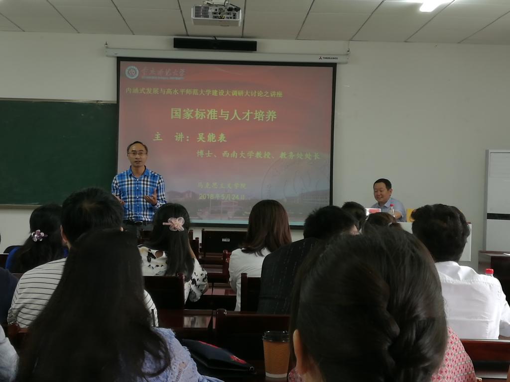 全院教师通过吴能表教授对《国家标准与人才培养》的详细讲解,进一步了解了《普通高等学校本科专业类教学质量国家标准》制定意义,明确了马克思义理论类教学质量国家标准,明晰了思想政治教育专业培养目标。此次讲座,对学院内涵式发展具有指引作用,对提高思想政治教育专业人才培养质量、积极推进教学改革及不断提高专业教学水平均有积极的意义。