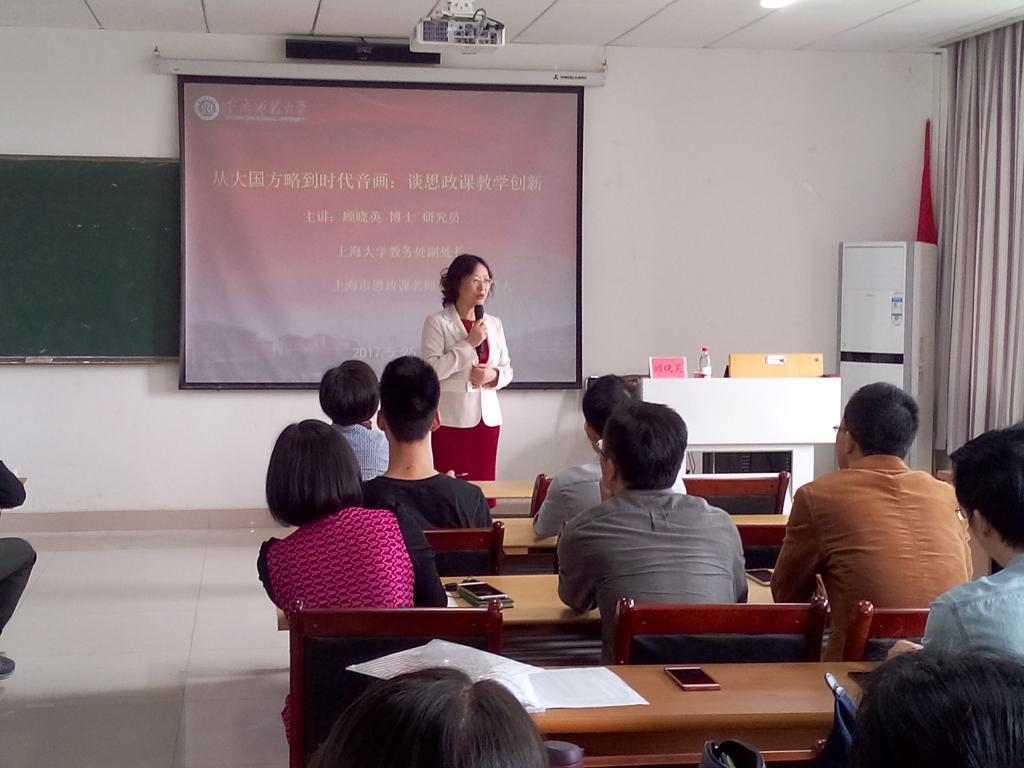 邀请,上海大学教务处副处长顾晓英博士在学院201会议室与全院思政课教师做了“从‘大国方略’ 到‘时代音画’ :谈思政课教学创新”的教学交流。交流会由学院党委书记万朝晖主持。