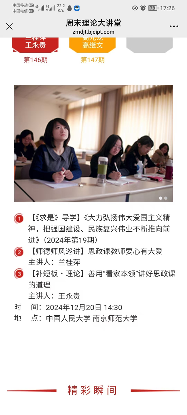的全国优秀教师、兰桂萍教授受邀,面向全国思政课教师开展《<求是>导学:大力弘扬伟大爱国主义精神,把强国建设、民族复兴伟业不断推向前进》的主题授课和《思政课教师要心有大爱》师德师风巡讲。