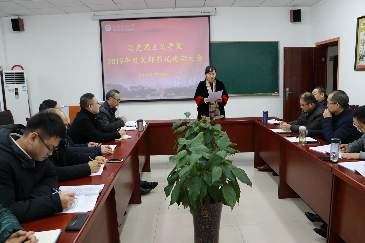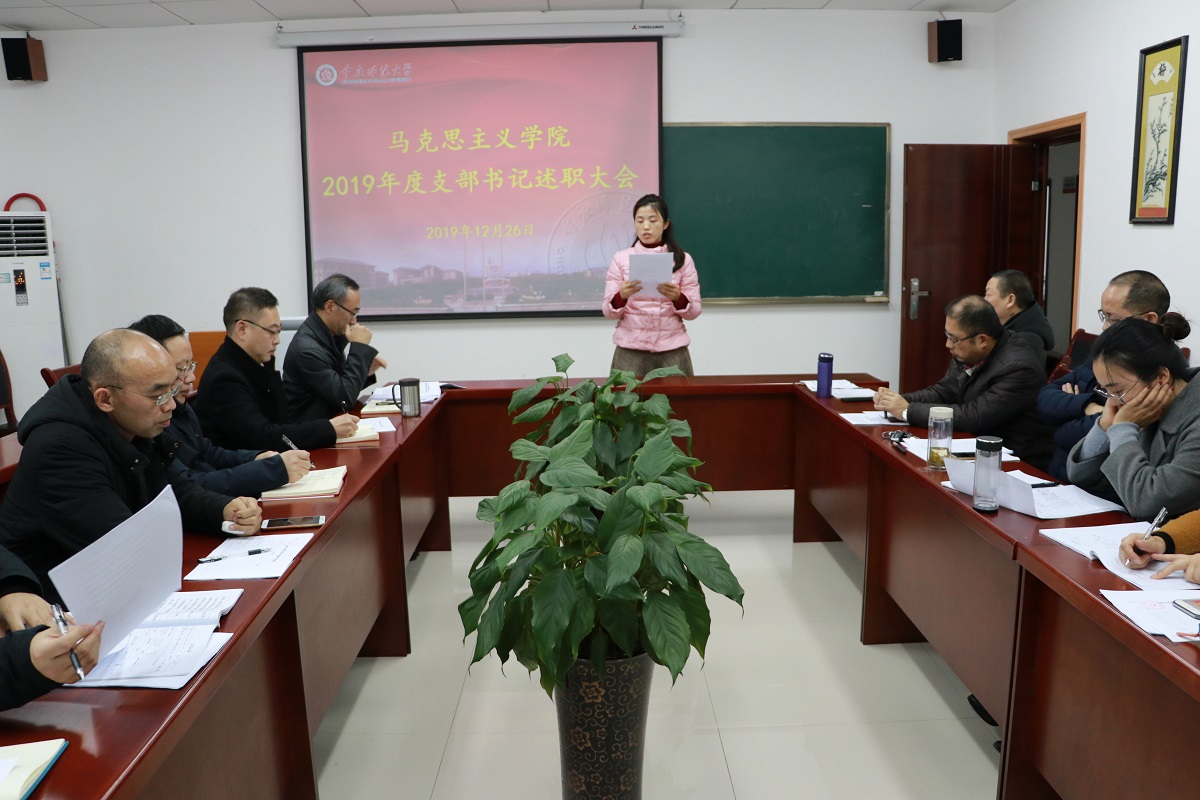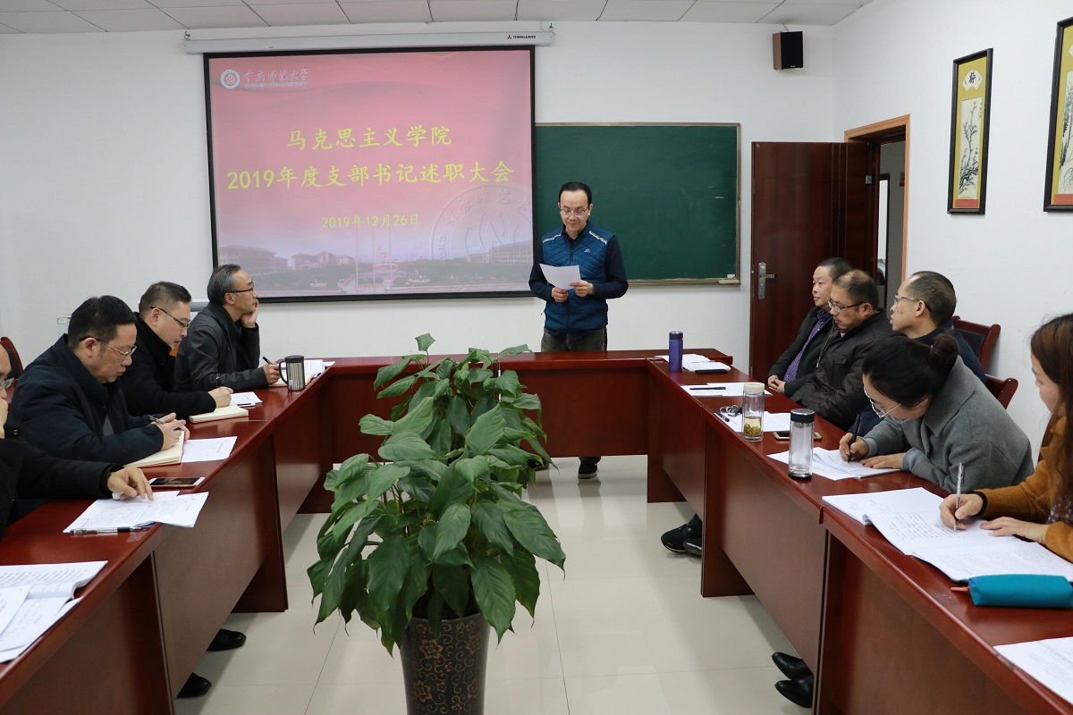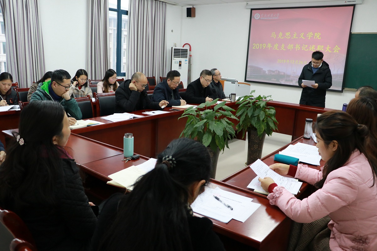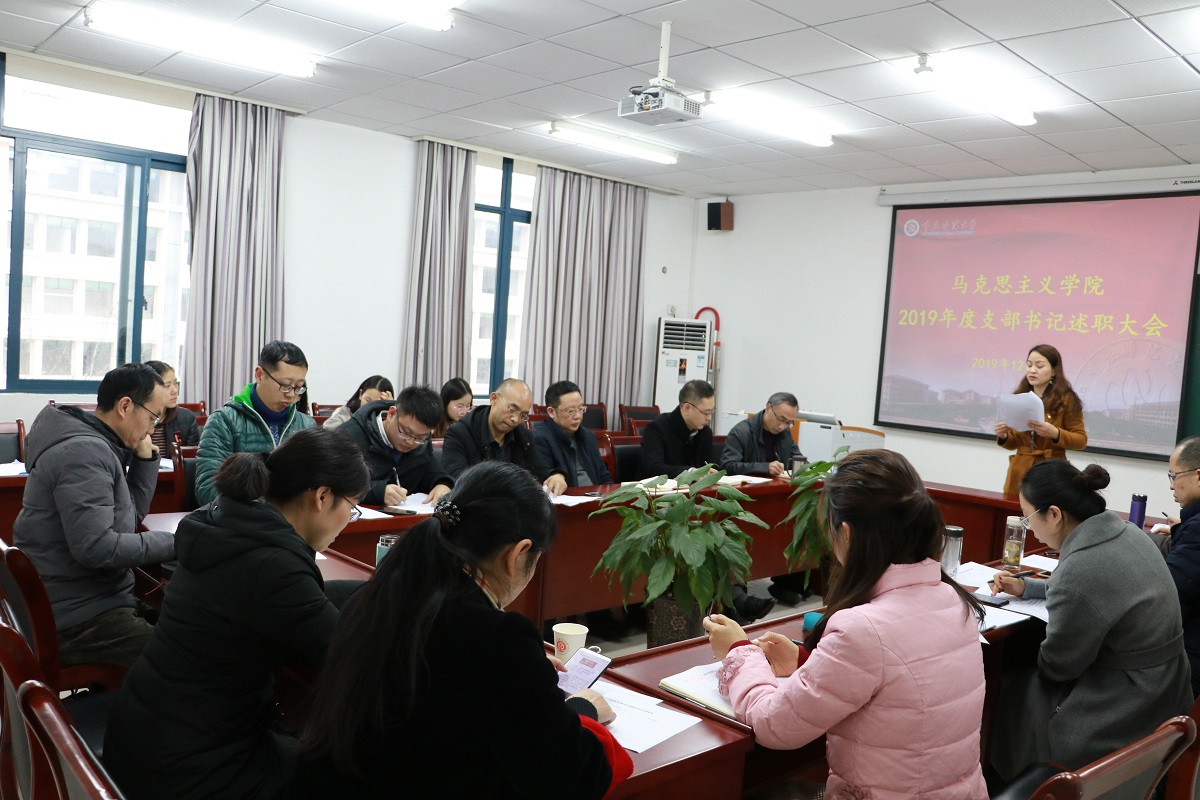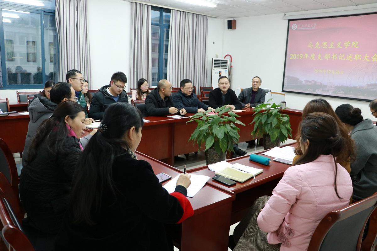 述职开始前,刘军书记传达了2019年度党建工作考核的文件精神,并对年终考核的重要性作了强调。紧接着,马基原党支部、毛中特党支部、纲要与行政党支部、思法党支部、研究生党支部、学生一支部、学生二支部的支部书记(或代理书记)就2019年度的履职情况、存在的突出问题及下一步打算措施三个方面向学院党委做了汇报。通过“不忘初心、牢记使命”主题教育第一阶段的学习以及对支部委员会的问题检视,各支部表示在接下来的工作中将切实展开整改。教师支部结合思想政治理论课教师工作性质和特点,将支部工作在“党员教师先锋课堂” 建设中得到升华。