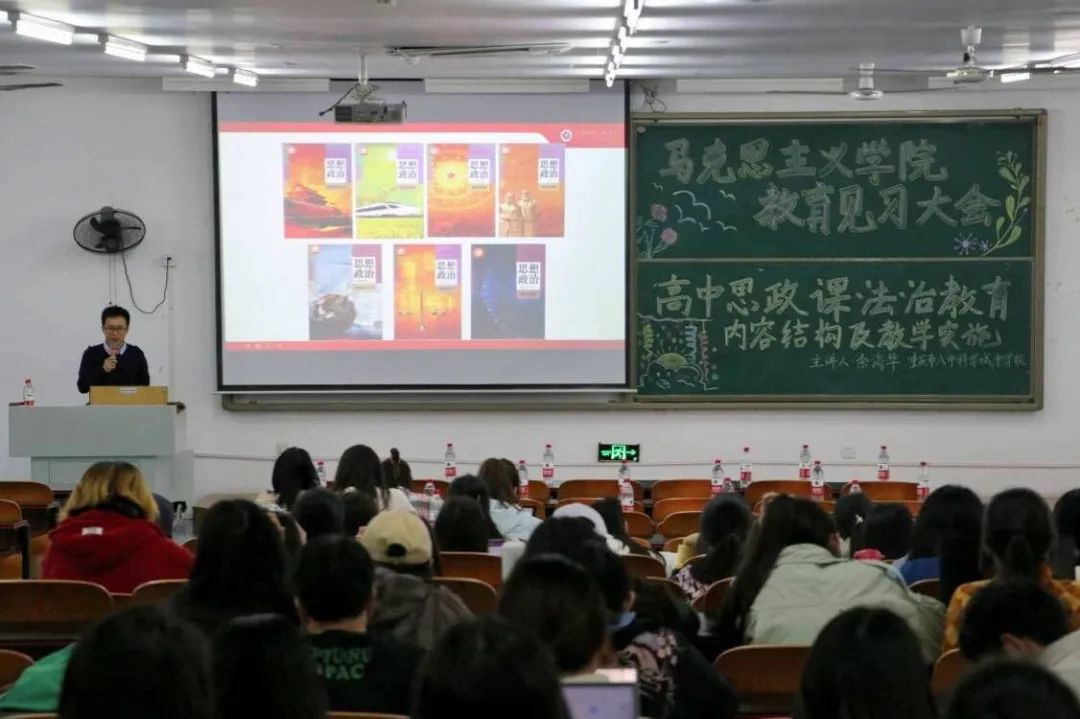 2010届思想政治教育专业本科毕业生、现就职于重庆市八中科学城中学校的余海毕老师作题为“高中思政课法治教育内容结构及教学实施”专题讲座,讲座由侯玲副院长主持。