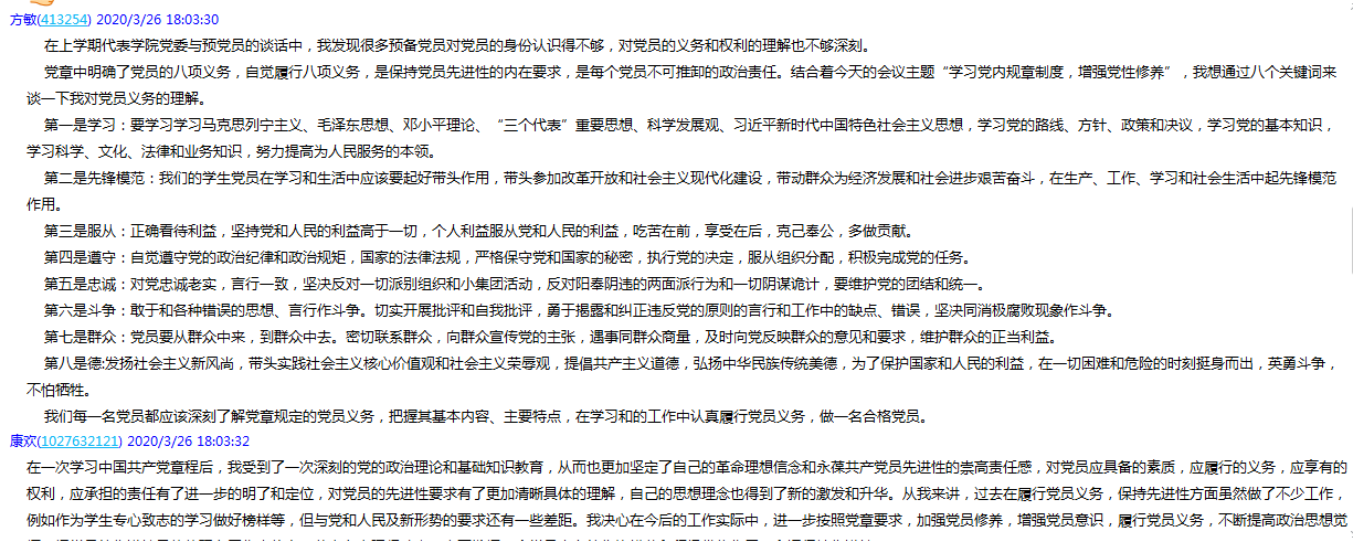 会议之初,由钟美琪组织大家进行线上签到,随即宣布会议开始,并对此次会议主要内容做了说明。会议开始的前30分钟是大家自行学习时间,结合视频材料学习《中国共产党章程》、《2019-2023全国党员教育培训工作规划》。随后大家分享各自的学习心得,分享由上学期新发展的六位预备党员开始,大家结合学习、工作和生活实际展开分享,其中方敏同志说到作为党员要对八项义务和八项权利有清晰的认识。大家畅所欲言,讨论热烈,会议于18:20圆满结束。