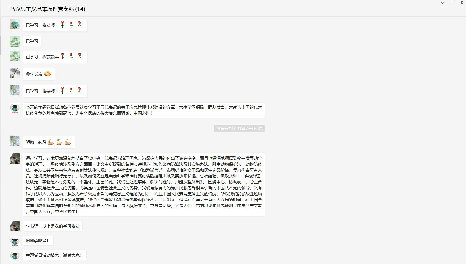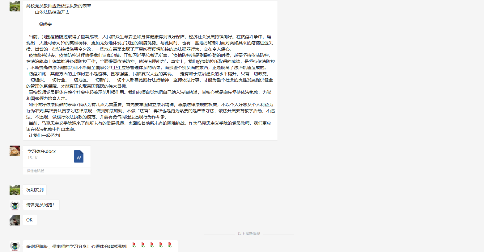 马克思主义基本原理概论教研室支部于2020年3月26日下午在微信支部群中开展了以“全面提高依法防控依法治理能力,健全国家公共卫生应急管理体系”为主题的线上党日活动。