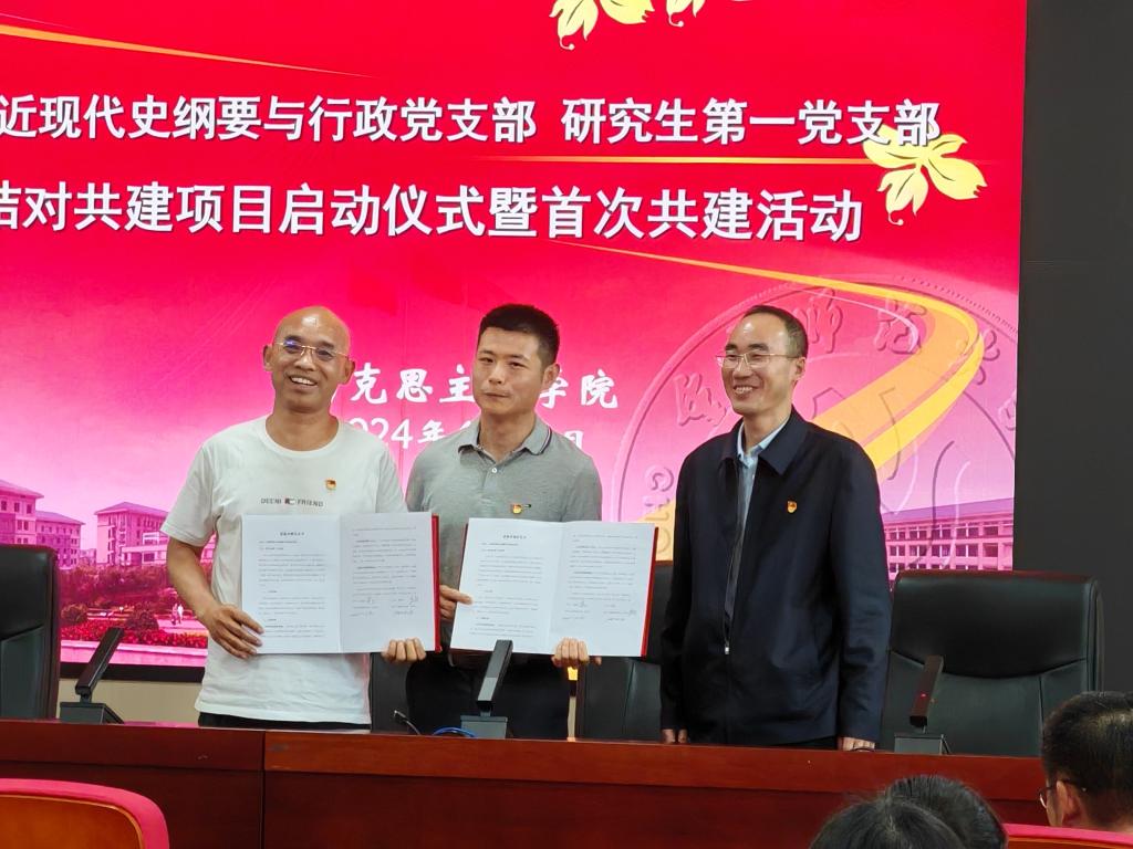 会议第一项议程:研究生第一党支部与中国近现代史纲要与行政党支部结对共建项目启动暨首次共建活动。共建活动第一步,是启动结对共建项目。研究生第一党支部书记李剑同志、史纲与行政支部支部书记黄正同志分别发表讲话,高度肯定俩个支部共建的意义,简要介绍了未来合作的内容与方式,并签署共建协议。协议签订之后,学院党委书记李晓燕同志提出未来两个支部要紧密联系、相互合作和相互促进,结出硕果的愿景。