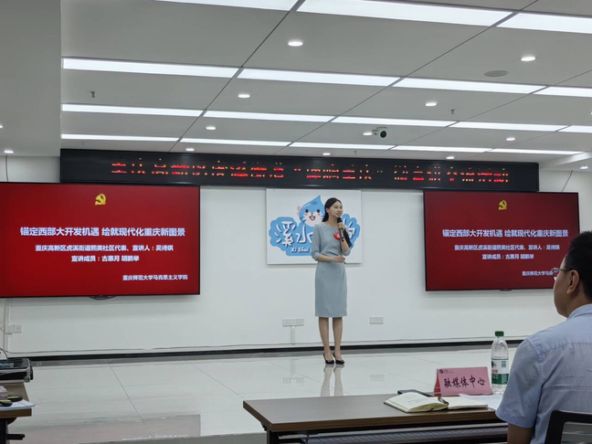 “概论”教研室党支部组织并指导学院王铭椰、吴诗琦、陈倩等6位研究生,经过一个月多的理论内容建构打磨、材料收集选择、宣讲能力培训提升等准备工作,两支微宣讲队伍结合熙美社区文化建设实际和重庆作为西部大开发战略支点,以透彻的理论分析、丰富的实际材料、富有感染力的语言,于2025年7月16日在重庆市高新区虎溪街道6楼会议室参加微宣讲交流活动,获得三等奖和优秀奖的成绩。