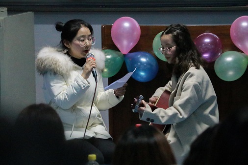 随后,刘思和罗滢滢同学带来吉他演唱《遥远的你》,温暖的画面、舒适的歌声让人沉醉。最后,进行“你划我猜”的游戏环节,在场同学自愿上场进行一人比划、两人猜词的游戏。