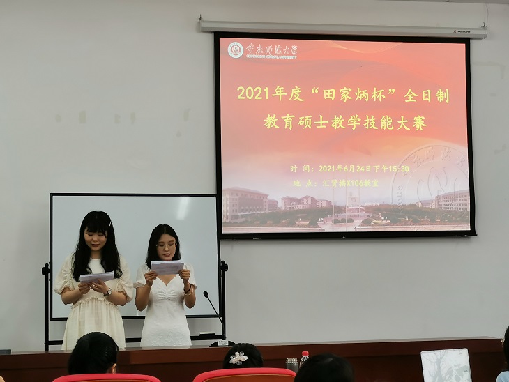 2021624日,为进一步提升全日制教育硕士教育教学实践能力,2021年度“田家炳杯”全日制教育硕士教学技能大赛学科教学(思政)组比赛在汇贤楼106举行,本次比赛由刘寿堂教授、侯玲教授、孔庆茵教授、吴涯副教授担任评委。研究生米果、苟亚亚担任主持人。