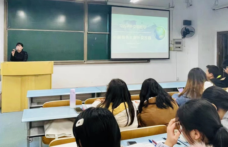 刘军部长结合“两个大局”阐释了习近平外交思想产生的时代背景和国际环境;结合习近平外交思想的主要框架和核心要义,以“十个坚持”概括了习近平外交思想的具体内容和重要地位;结合《论坚持推动构建人类命运共同体》、倡导和推进“一带一路”建设、深化拓展对外战略全方位布局、积极提供中国智慧和中国方案、坚决捍卫国家主权安全和发展利益、牢牢占据国际道义制高点等方面阐明了中国特色大国外交的主要成就和具体实践;结合当前国内外疫情防控形势中凸显中国特色社会主义制度的显著优势和中国为世界疫情防控所作出的巨大贡献,引导同学们进一步增强“四个意识”、坚定“四个自信”、做到“两个维护”。