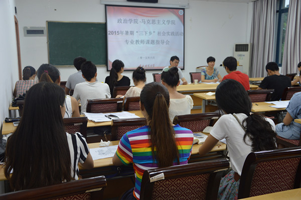 结合学校实际,部署了2015年暑期“三下乡”社会实践活动。政治学院积极响应学校号召,组织筹划具体实践项目和课题,并于2015年6月29下午14时,在学院楼201举行了“三下乡”课题调研专业指导培训会。培训会由政治学院团总支书记马小又主持,陈钢老师应邀出席并担任专业指导老师,2015年暑期“三下乡”的全体同学参与了此次培训会。
