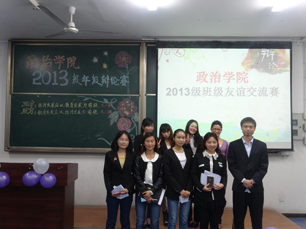 比赛双方为正方2013级大一班与反方2013级大二班。正方观点为:经济发展应以教育发展为前提,反方观点为:教育发展应以经济发展为前提。