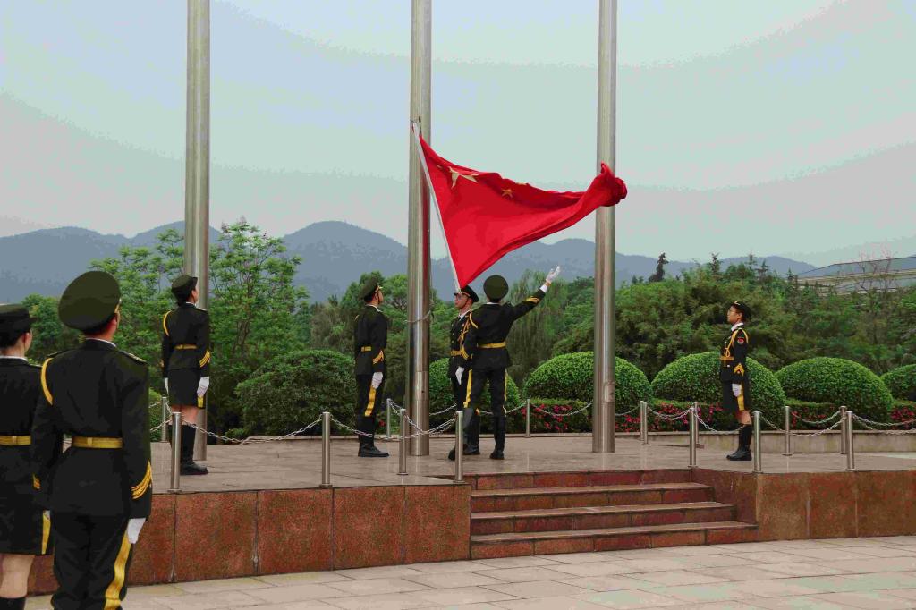 活动进行第一议程:升国旗仪式。7时45分,学院师生于正校门广场列队完毕。国旗护卫队的队员们昂首挺胸,迈着铿锵有力的步伐,护卫鲜艳的五星红旗入场。《义勇军进行曲》奏响,全体师生向五星红旗行注目礼,齐唱国歌,庄严肃穆。