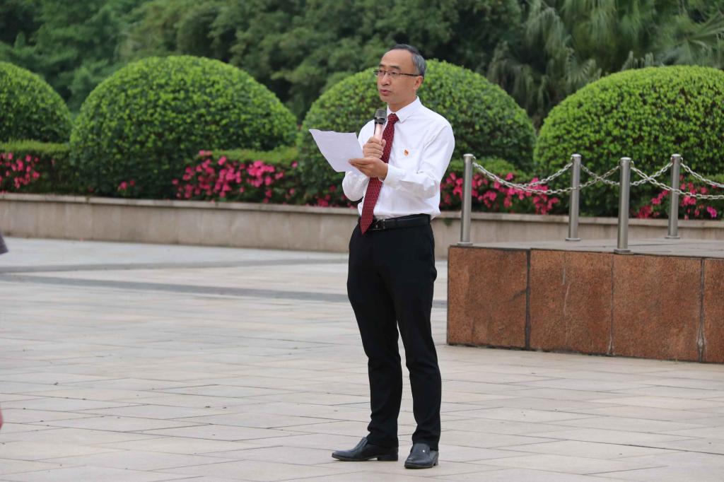 朗诵表演结束,活动进行第三议程,院党委书记刘军作国旗下讲话。当前正值全党上下开展党史学习教育之际,刘军书记带领全体师生重温历史、放眼当下、展望未来。马院师生身为马克思主义的传承者和践行者、中国特色社会主义的建设者和接班人,刘军书记寄予厚望,提出三点建议:第一,在党史学习教育中坚定理想信念。缅怀革命先烈,汲取精神力量;第二,在党史学习教育中不断坚定“四个自信”,增强做中国人的志气、骨气、底气;第三,在党史学习教育中充分吸取成长营养,党建历程是党史学习教育最好的营养剂。刘军书记期望马院师生从党的百年苦难、辉煌中汲取成长力量,淬炼思想、磨砺人生,勇敢肩负时代责任、使命,以实际行动和优越成绩迎接建党百年。