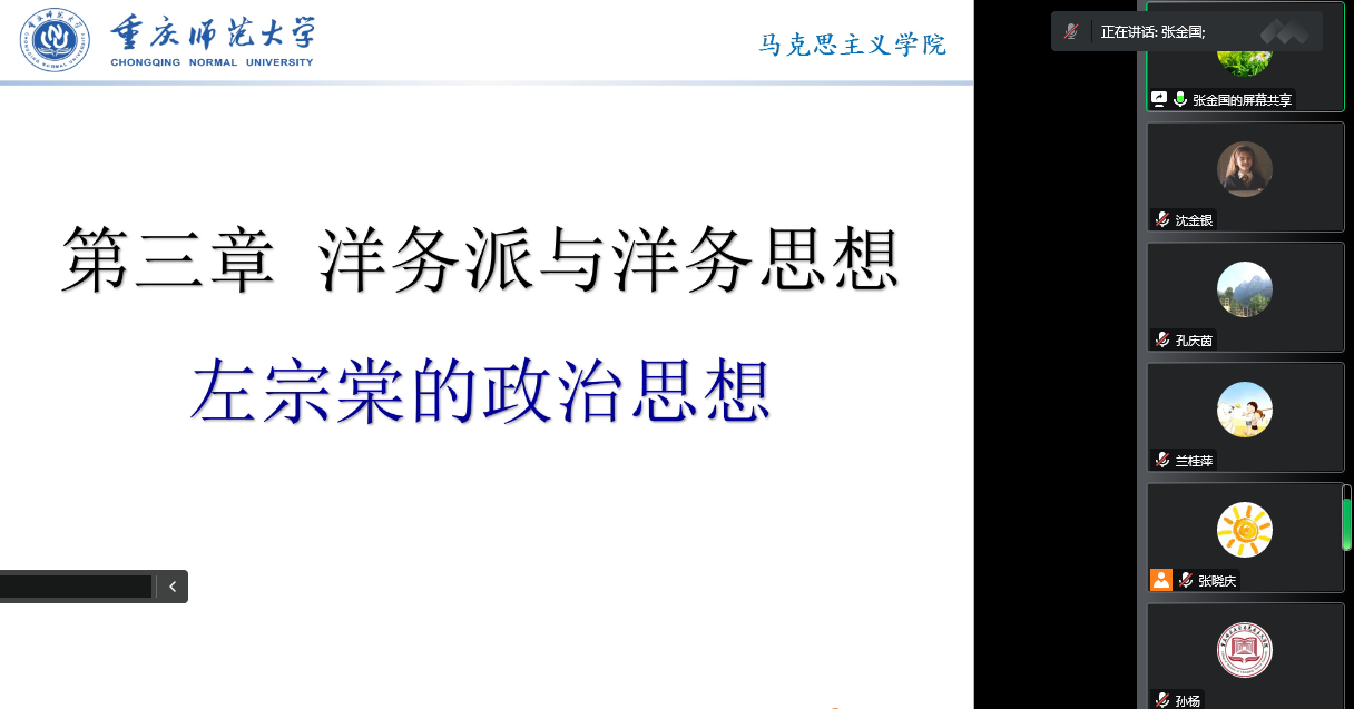 在教学示范观摩课环节,两位青年优秀教师分别从思政课程和课程思政两个类型课程进行了教学展示。孙杨副教授选取思政课之《马克思主义基本原理》课程中的“认识的本质”小节,将理论与案例相结合、技术与艺术相结合,在注重学科价值引领的同时,将线上教学的有效互动做了精彩的展示。张金国副教授选取专业课程之《中国近现代政治思想史》课程中“左宗棠的政治思想”小节,从引人入胜的课堂导入开始,引导学生进行理性深思,有效地实现了专业课知识目标与价值目标的高度融合。接着,思政部副主任兰桂萍副教授、政教系主任左秋明教授对两位老师的示范观摩课进行了精彩点评,指出两位老师都能紧扣课程内核,切实坚持“以学生为中心”的教育理念,真正使课堂达到了高质量育人效果。