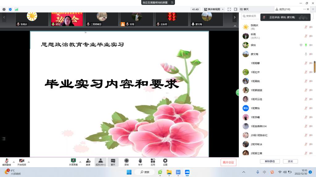 学子学习成效,促进学生对所学知识技能进行实践转化和深化运用,保障实习工作顺利开展,学院于2022年12月30日上午10点召开2020级思想政治教育专业本科生实习动员大会。学院实习领导小组及2020级全体本科生出席本次活动。本次大会由2020级本科生蒋楸芸主持。