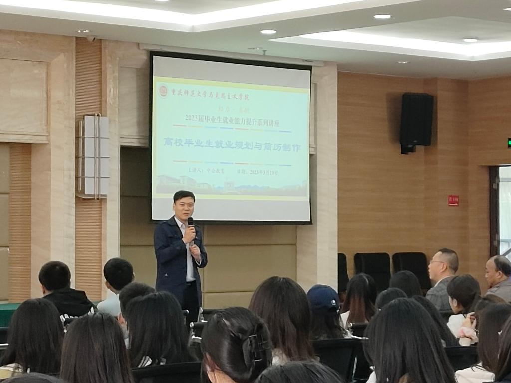 分别于3月10日、3月15日开展“助力·启航”2023届毕业生就业能力提升系列讲座。本系列讲座特邀中公教育重庆分校校长魏涛、中公教育重庆分校校长助理丁华全为嘉宾。两场讲座线上线下同步开展,分别由学院党委副书记方敏、2019级本科毕业生班主任陈沉主持,2023届全体毕业生积极参会。