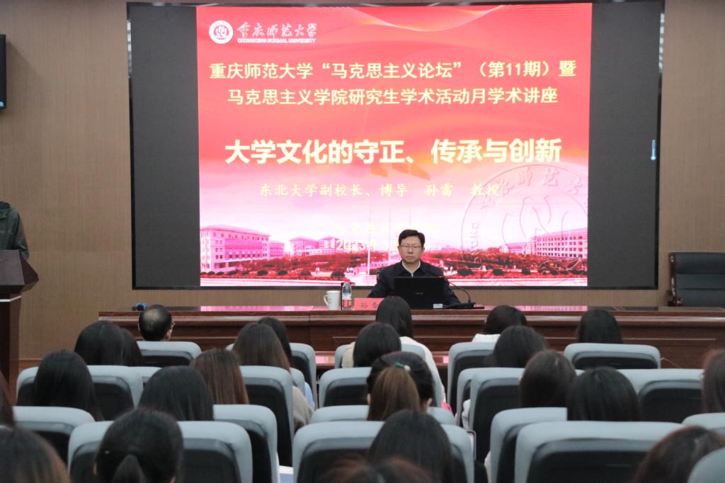 师生作题为“大学文化的守正、传承与创新”的学术讲座。本次讲座系重庆师范大学马克思主义论坛(第11期)暨研究生学术活动月系列讲座。学院副院长姜土生教授主持本次讲座并对孙校长到来表示欢迎,学院师生代表到场学习。