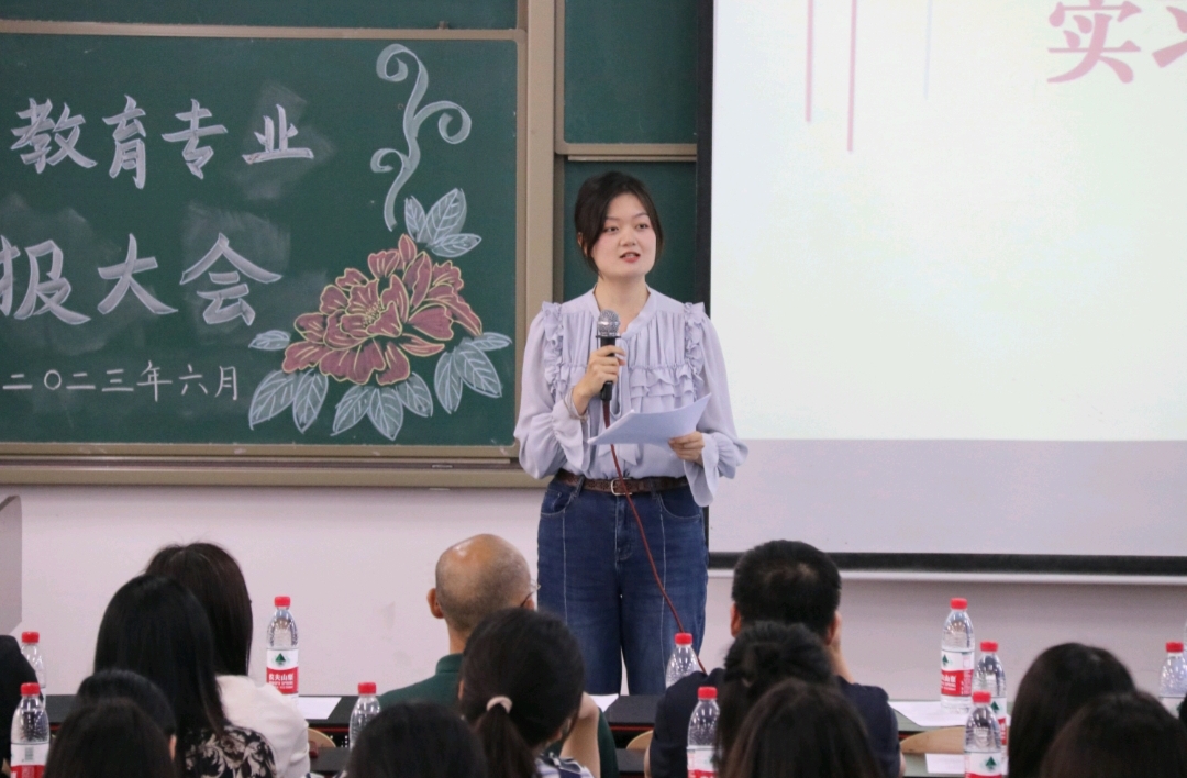 院党委书记李晓燕老师讲话。李书记首先感谢学校督导组、所有实习指导老师以及在场实习生们辛苦付出,他们的付出对于此次实习工作圆满结束具有重要意义。而后李书记对在场实习生们提出三点要求与期望:一是将理论与实践相结合,推动学业、技术、专业技能的结合;二是不断巩固自身知识与教师技能储备,营造一个“探究、互动、沉浸、体验”型课堂;三是适应角色的转变,要全方位、多角度深入研究教师角色,真正做到笃定教育情怀、夯实教育基础、提升技能素质、练就过硬本领。