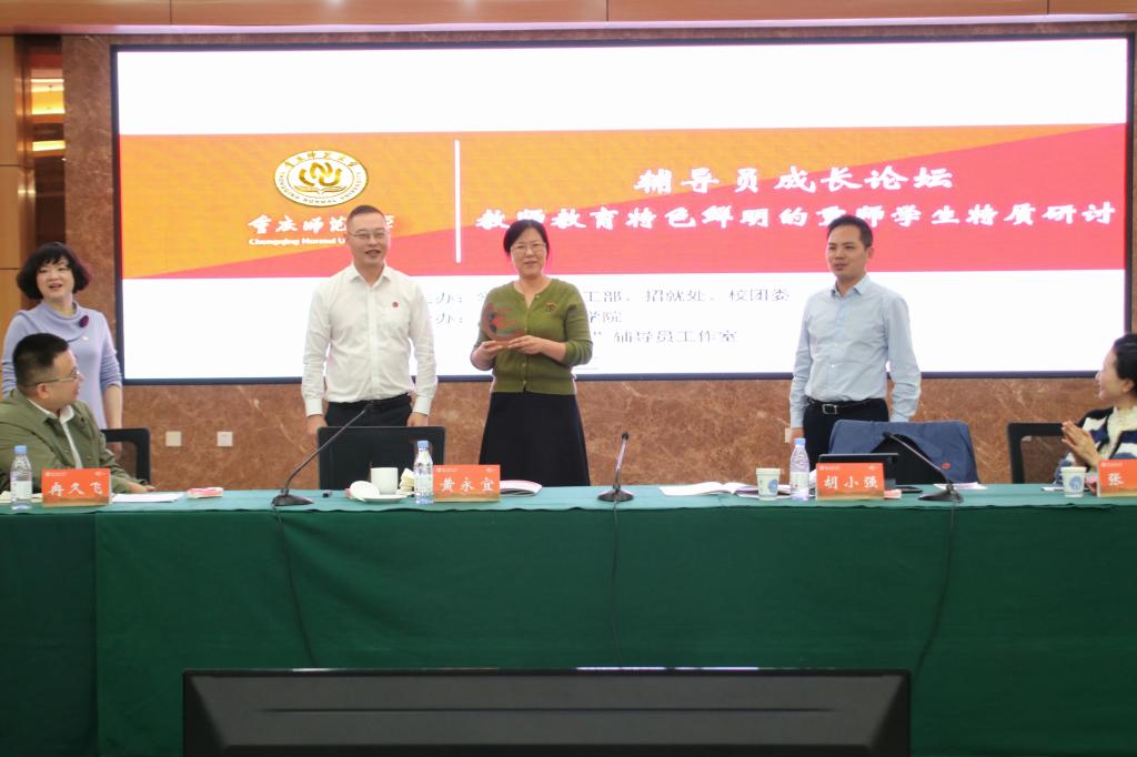 集中研讨,探索教师教育特色鲜明的重师学生特质。各学院分管学生工作副书记与辅导员代表们首先结合自身育人经历,分析不同学院学子的特质与特长,从“重师学生具有的特质”“辅导员应培养出的学生特质”“怎样培育学生的特质”等不同角度积极发言,各抒己见。冉久飞处长认为重师学子首先就应“学高”“身正”,并强调现在学生工作者应从政治上着眼、思想上入手,将学生培养为政治上可靠、思想上过硬的“四有”好老师。胡小强处长通过展示重师学子想像设计案例“师小博”“师小雅”,指出重师学子应具备“理想信念”“博学雅致”“阳光生动”等特质,在培养自身素质的同时积极探寻重师学子形象传播的路径。